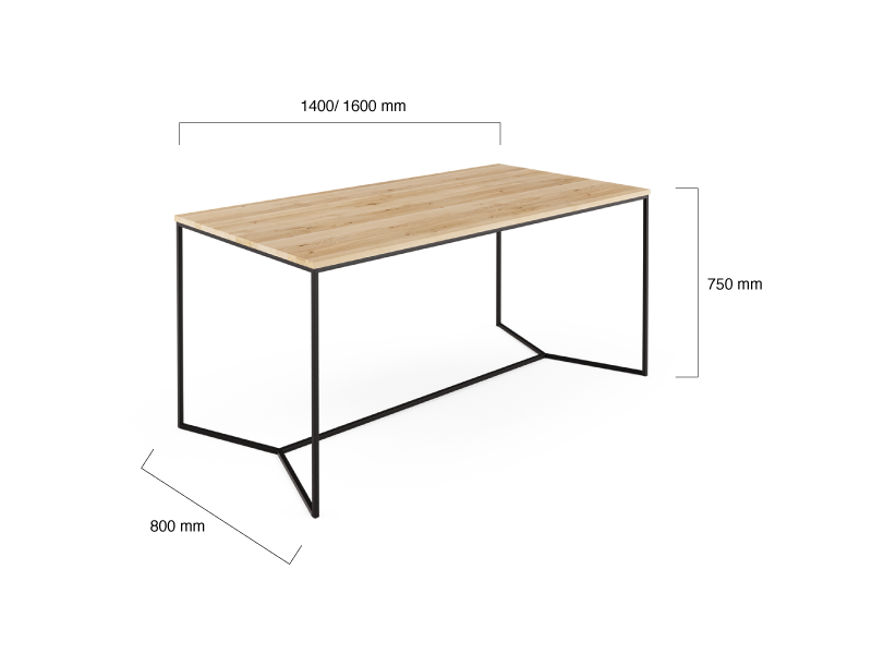 Ergonomiczny, minimalistyczny o stabilnej, lecz delikatnej formie. Posiada minimalistyczny blat z litego dębu (20 mm) oraz cienkie stalowe profile.