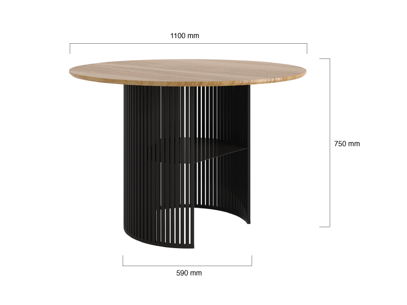 Niezwykle ambitna, wykonana ręcznie konstrukcja stalowa to ugięte stalowe okręgi połączone precyzyjnymi profilami. Stół jest zamknięty i otwarty jednocześnie. Ażurowy i tajemniczy. Wdzięcznie ukryta stalowa półka ma cudowne zastosowania związane z drobnym przechowywaniem.